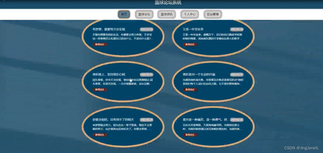 篮球论坛系统,在系统首页可以查看首页、篮球论坛、篮球资讯、个人中心、后台管理等内容,并进行详细操作,如图5-1所示。