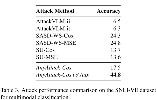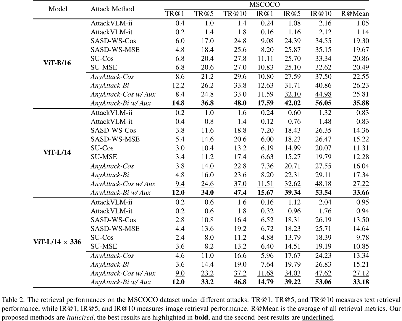 | 模型 | 最佳基线 | AnyAttack-Bi w/Aux | 提升幅度 |