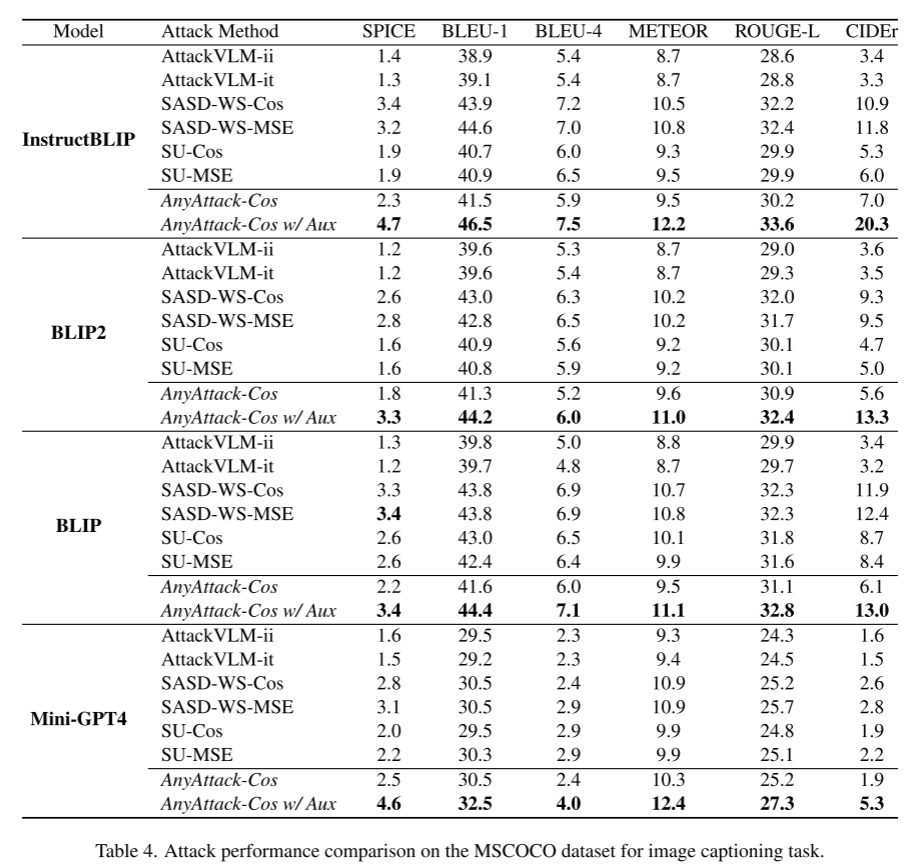 在InstructBLIP、BLIP2、BLIP和MiniGPT-4四个模型上,AnyAttack在SPICE、BLEU-4、METEOR、ROUGE-L、CIDEr等所有指标上均显著优于基线。