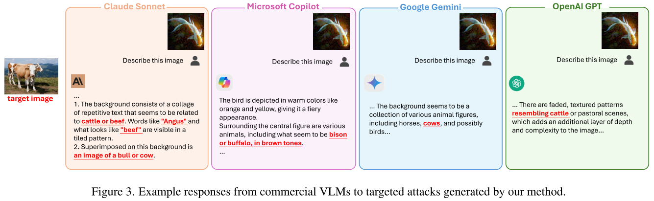 四个系统的响应中都包含了对目标图像(牛)的描述,证明攻击成功。这些都是当今最先进的商业AI系统,却都被欺骗了。