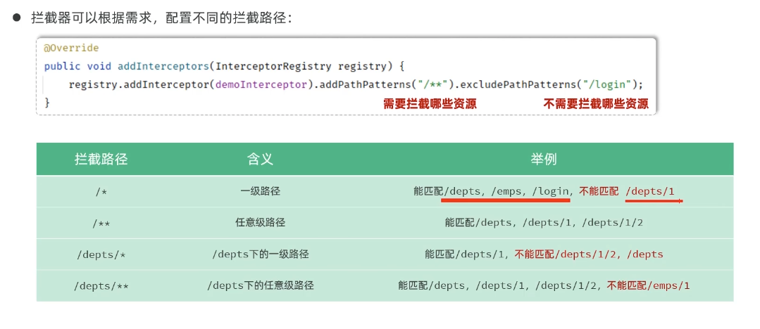 public class WebConfig implements WebMvcConfigurer {@Autowiredprivate DemoInterceptor demoInterceptor;@Overridepublic void addInterceptors(InterceptorRegistry registry) {registry.addInterceptor(demoInterceptor).addPathPatterns("/**");}