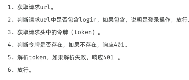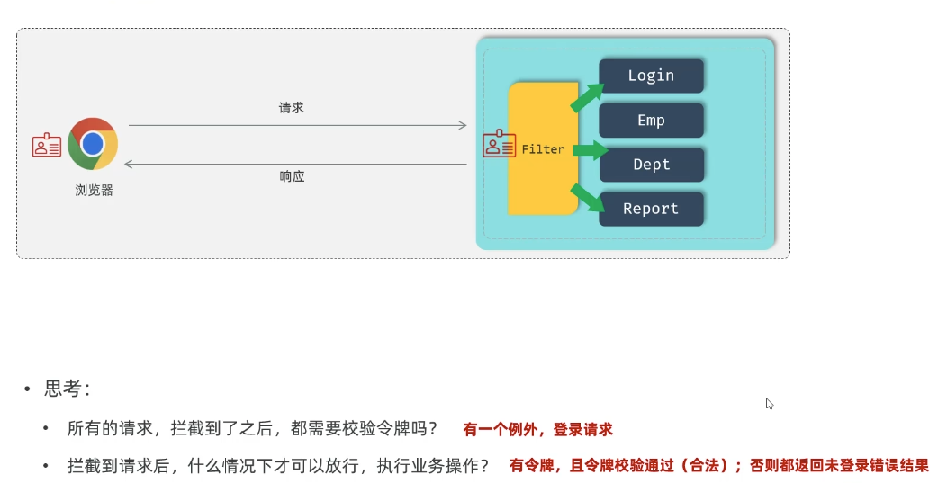 public class TokenFilter implements Filter {@Overridepublic void doFilter(ServletRequest servletRequest, ServletResponse servletResponse, FilterChain filterChain) throws IOException, ServletException {HttpServletRequest request = (HttpServletRequest) servletRequest;HttpServletResponse response = (HttpServletResponse) servletResponse;//1.获取请求路径String requestURI = request.getRequestURI();//2.判断是否为登录请求,是则放行if(requestURI.contains("login")){log.info("登录请求,放行");filterChain.doFilter(request,response);return;}//3.获取tokenString token = request.getHeader("token");log.info("token:{}",token);//4.判断token是否存在,不存在返回401状态码if(token == null || token.isEmpty()){log.info("token不存在,返回401状态码");response.setStatus(401);return;}//5.如果token存在,校验tokentry{JwtUtils.parseJWT(token);}catch (Exception e){log.info("token无效,返回401状态码");response.setStatus(401);return;}//6.放行log.info("token有效,放行");filterChain.doFilter(request,response);}