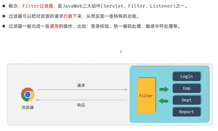 @Overridepublic LoginInfo login(Emp emp) {//1.调用mapper接口,根据用户名和密码查询员工Emp e = empMapper.selectByUsernameAndPassword(emp);//2.判断员工是否为空if(e!= null){log.info("登录成功,员工信息:{}", e);Map<String,Object> claims = new HashMap<>();claims.put("id",e.getId());claims.put("username",e.getUsername());String jwt = JwtUtils.generateJwt(claims);return new LoginInfo(e.getId(),e.getUsername(),jwt,e.getName());}//3.不存在返回NULLreturn null;}过滤器Filter