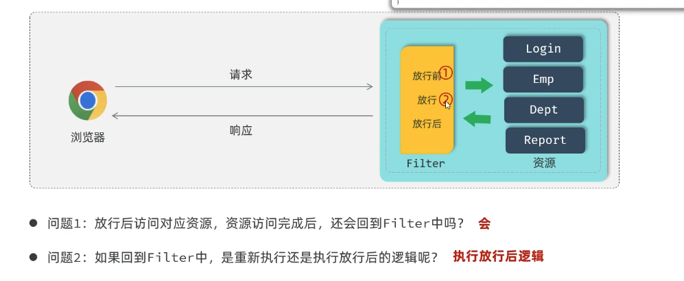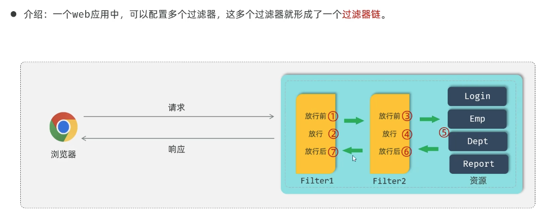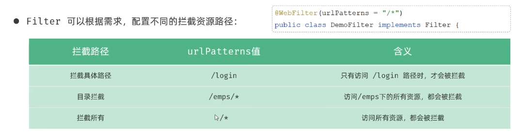 public class DemoFilter implements Filter {@Overridepublic void init(FilterConfig filterConfig) throws ServletException {log.info("DemoFilter init...初始化方法运行");}//拦截到请求之后执行,会执行多次@Overridepublic void doFilter(ServletRequest servletRequest, ServletResponse servletResponse, FilterChain filterChain) throws IOException, ServletException {log.info("DemoFilter doFilter...执行方法运行");}@Overridepublic void destroy() {log.info("DemoFilter destroy...销毁方法运行");}