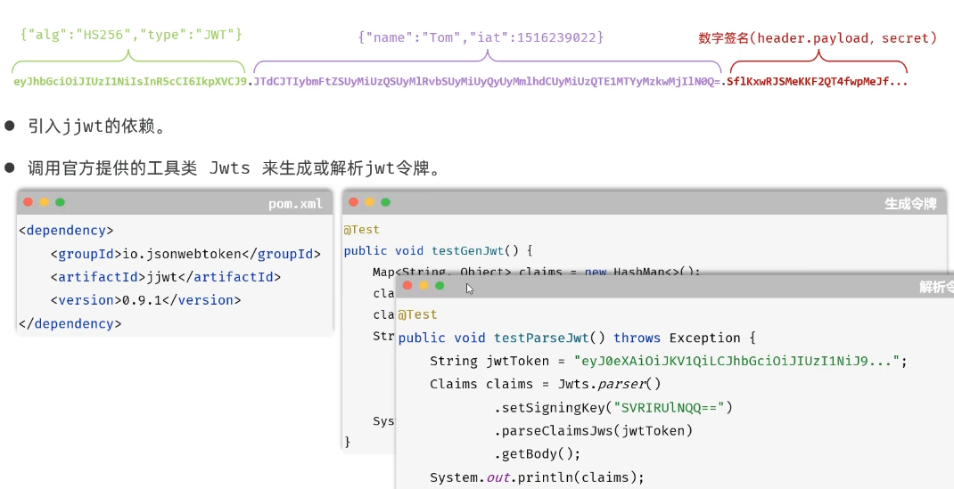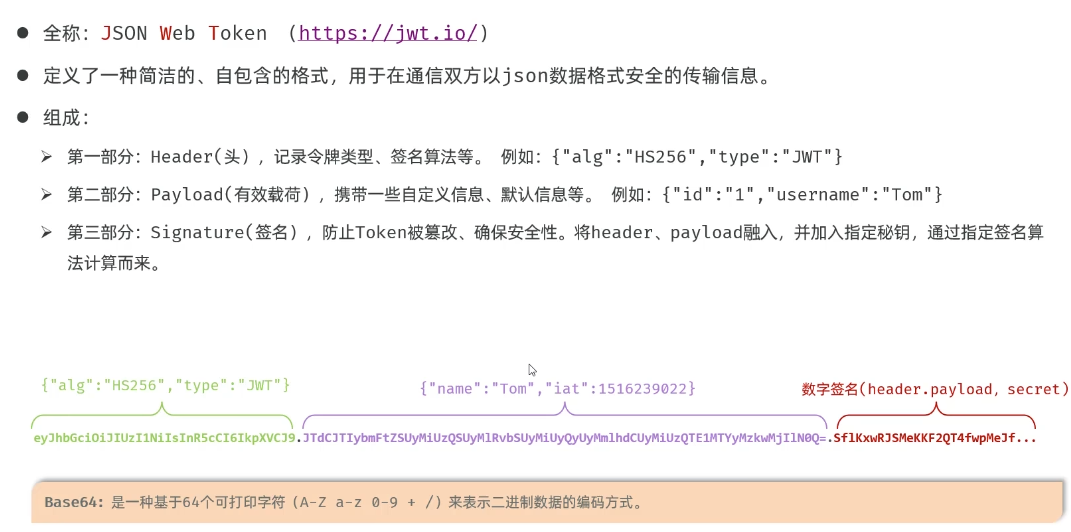 import java.util.Map;public class JwtUtils {private static String signKey = "RmVpVHduZA=="; // Base64编码的签名密钥private static Long expire = (long) (12 * 60 * 60 * 1000);/*** 生成JWT令牌* @return*/public static String generateJwt(Map<String,Object> claims){String jwt = Jwts.builder().addClaims(claims).signWith(SignatureAlgorithm.HS256, signKey).setExpiration(new Date(System.currentTimeMillis() + expire)).compact();return jwt;}/*** 解析JWT令牌* @param jwt JWT令牌* @return JWT第二部分负载 payload 中存储的内容*/public static Claims parseJWT(String jwt){Claims claims = Jwts.parser().setSigningKey(signKey).parseClaimsJws(jwt).getBody();return claims;}