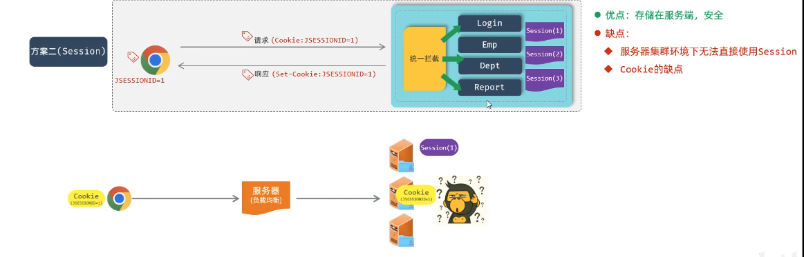 @GetMapping("/s1")public Result session1(HttpSession session){log.info("HttpSession-s1: {}", session.hashCode());session.setAttribute("loginUser", "tom"); //往session中存储数据return Result.success();}@GetMapping("/s2")public Result session2(HttpSession session){log.info("HttpSession-s2: {}", session.hashCode());Object loginUser = session.getAttribute("loginUser"); //从session中获取数据log.info("loginUser: {}", loginUser);return Result.success(loginUser);}