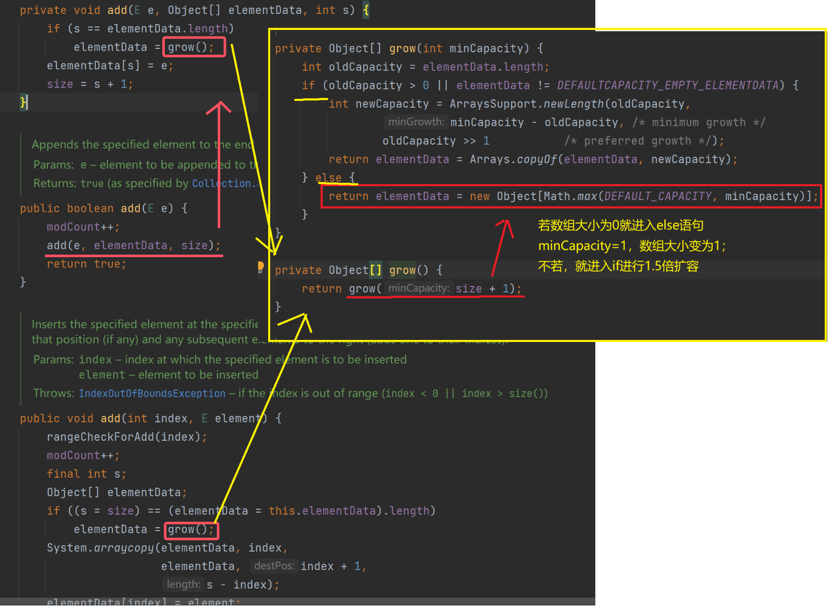 当我们未给ArrayList指定数组大小时,它底层的数组大小就是0;只不过在add()内会判断有效元素个数是否与数组大小相同,相同则扩容