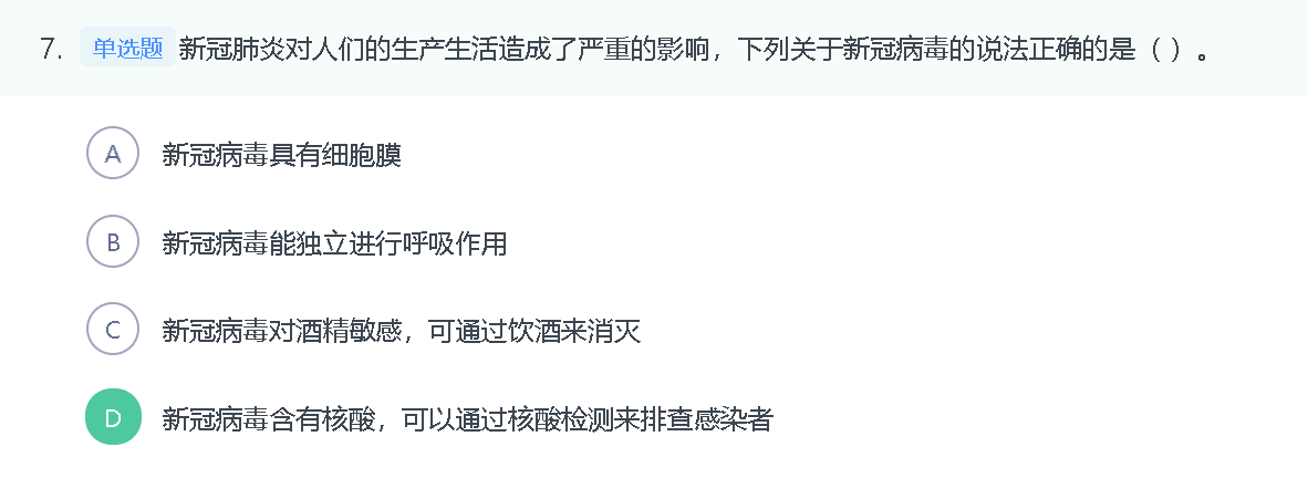 D项,新冠病毒的遗传物质可通过核酸检测检出,因此可以根据检测结果判断提供核酸样本的人是否为新冠病毒感染者,正确。