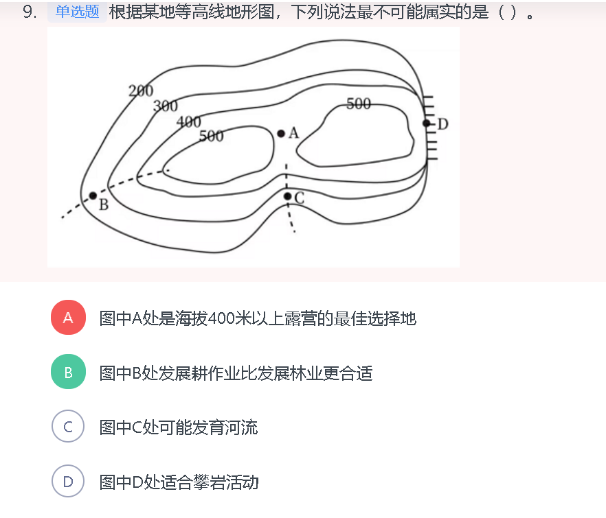 A项:根据等高线地形图“同线等高、同图等距”的特点可知,A处的海拔高于400米,低于500米。因为A处位于等高线地形图中两座山峰之间的空白部分,所以A处是鞍部地形。鞍部通常平坦而开阔,为露营提供了良好的条件,因此A处是海拔400米以上露营的最佳选择地,正确;