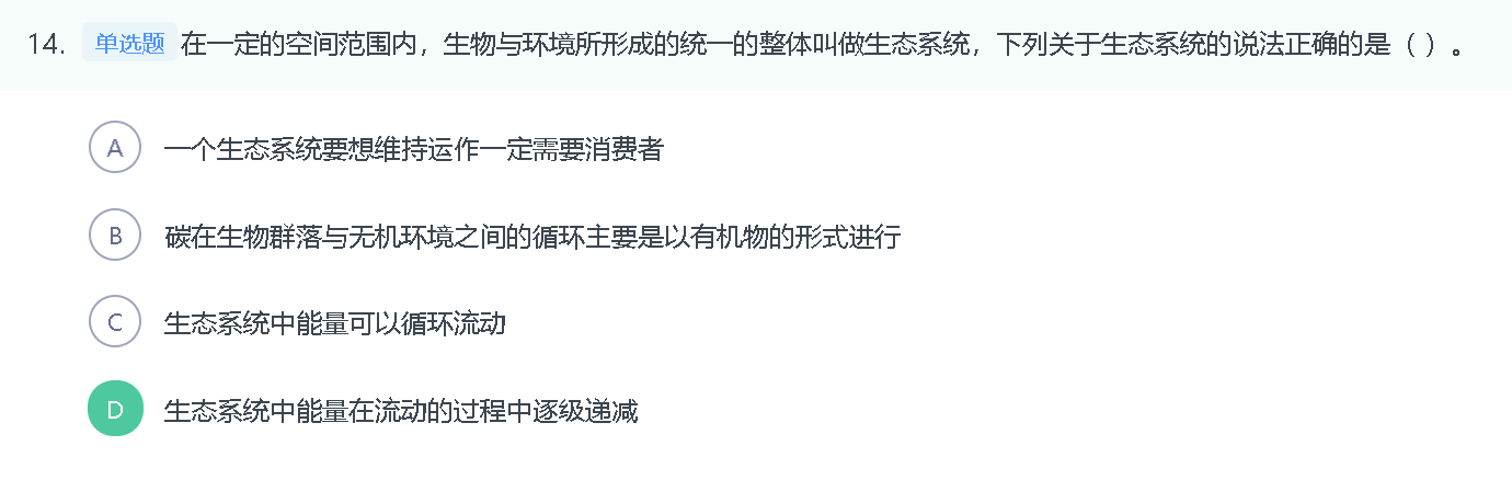 C项:生态系统中能量流动是单向的。在生态系统中,能量流动只能从第一营养级流向第二营养级,再依次流向后面的各个营养级,不能逆向流动,也不能循环流动,错误;