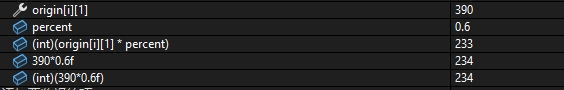 发来了一个断点截图,乍一看相当的诡异。又问了下每个变量的数据类型。这个orgin[i][1]是一个int,而percent是一个float,是通过策划配置的万分比整形6000转换出来的。不少人这里应该已经猜到了。这是个经典的浮点数精度问题。换成double以后就好了。不过本着换脑子的目的,发现了两个让人感兴趣的点。具体可看这段简单的示意代码(把数字做了点简化,效果是一样的)