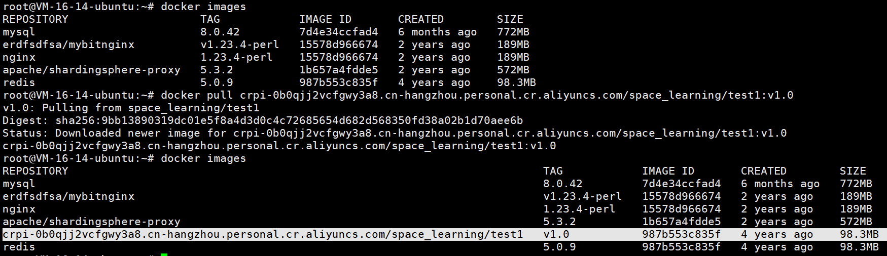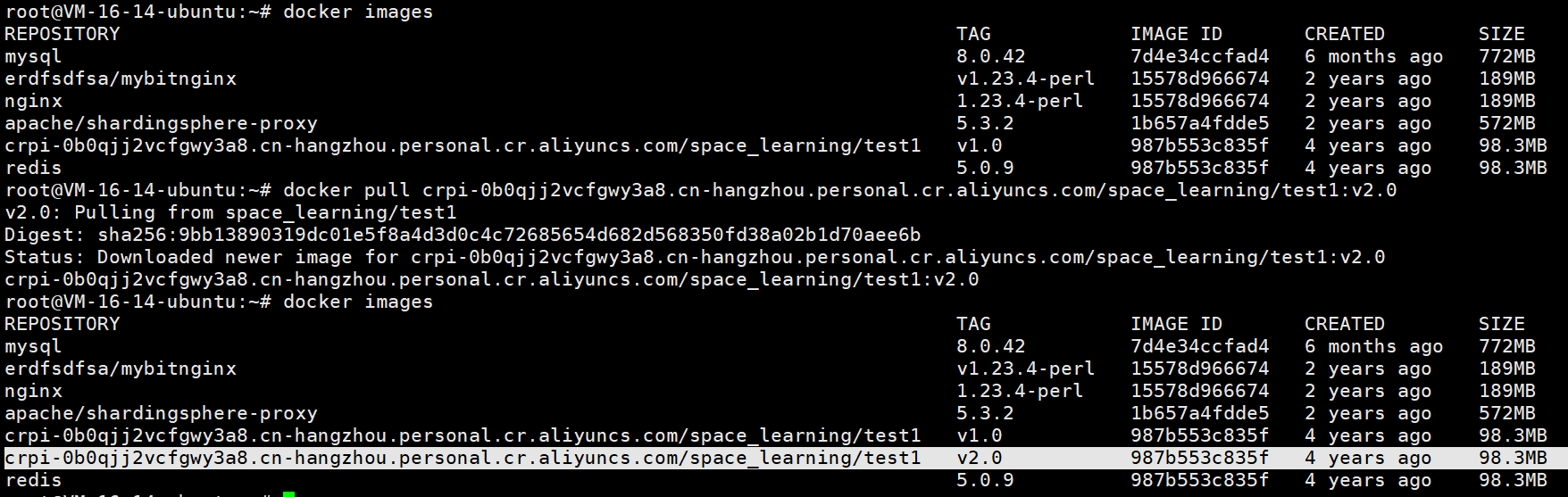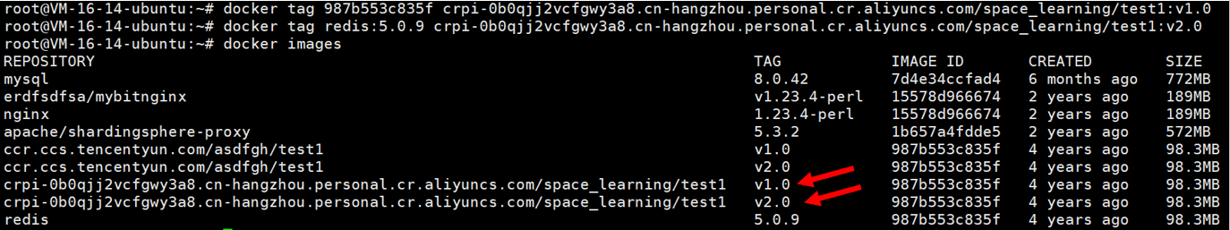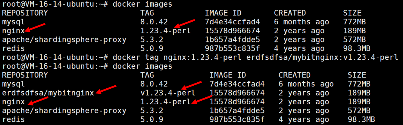 - 验证:执行 docker images,你会看到两个镜像条目(比如 ubuntu:22.04 和 myregistry.com/myubuntu:22.04),但它们拥有完全相同的 IMAGE ID。这证明它们本质上是同一个镜像文件,只是有两个不同的名字。