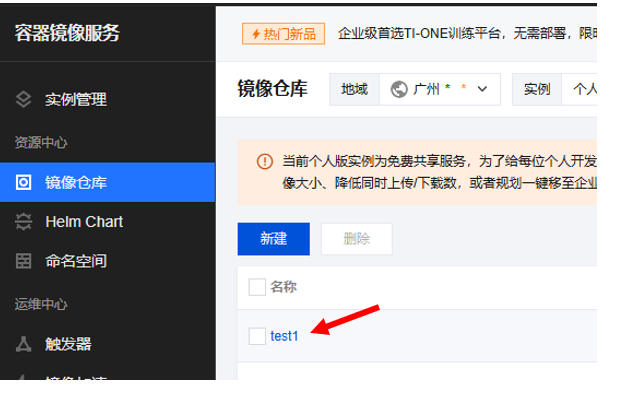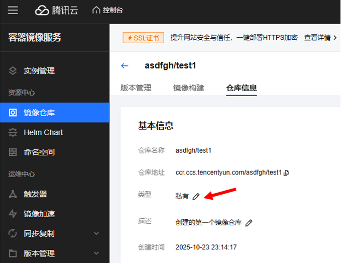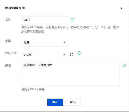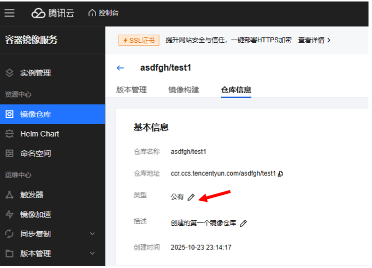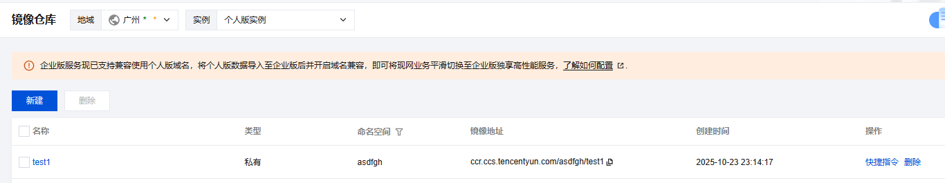 很好,创建好了。镜像地址是ccr.ccs.tencentyun.com/asdfgh/test1。