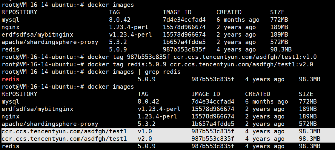 docker tag redis:5.0.9 ccr.ccs.tencentyun.com/asdfgh/test1:v2.0