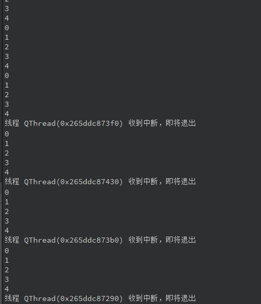 {qDebug() << "线程" << this << "启动,开始工作";while (!isInterruptionRequested()) { // 核心:循环检查中断信号for(int i=0;i<5;i++){qDebug()<<i;}QThread::msleep(100); // 短暂休眠,给中断信号响应机会}qDebug() << "线程" << this << "收到中断,即将退出";}