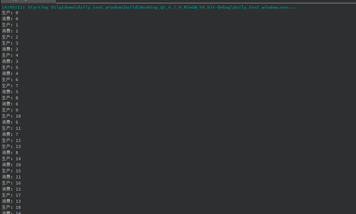 void Producer::run() {int data = 0;while (!isInterruptionRequested()) {freeSpace.acquire(); // 步骤1:等待有空闲空间buffer.append(data); // 步骤2:生产数据qDebug() << "生产:" << data;usedSpace.release(); // 步骤3:通知有数据可用data++;msleep(200);}