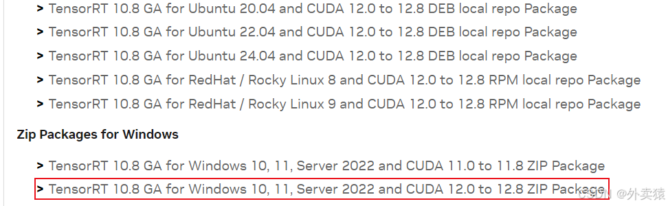 TensorRT版本的选择相对友好,在官网下载位置就有对应的cuda版本: