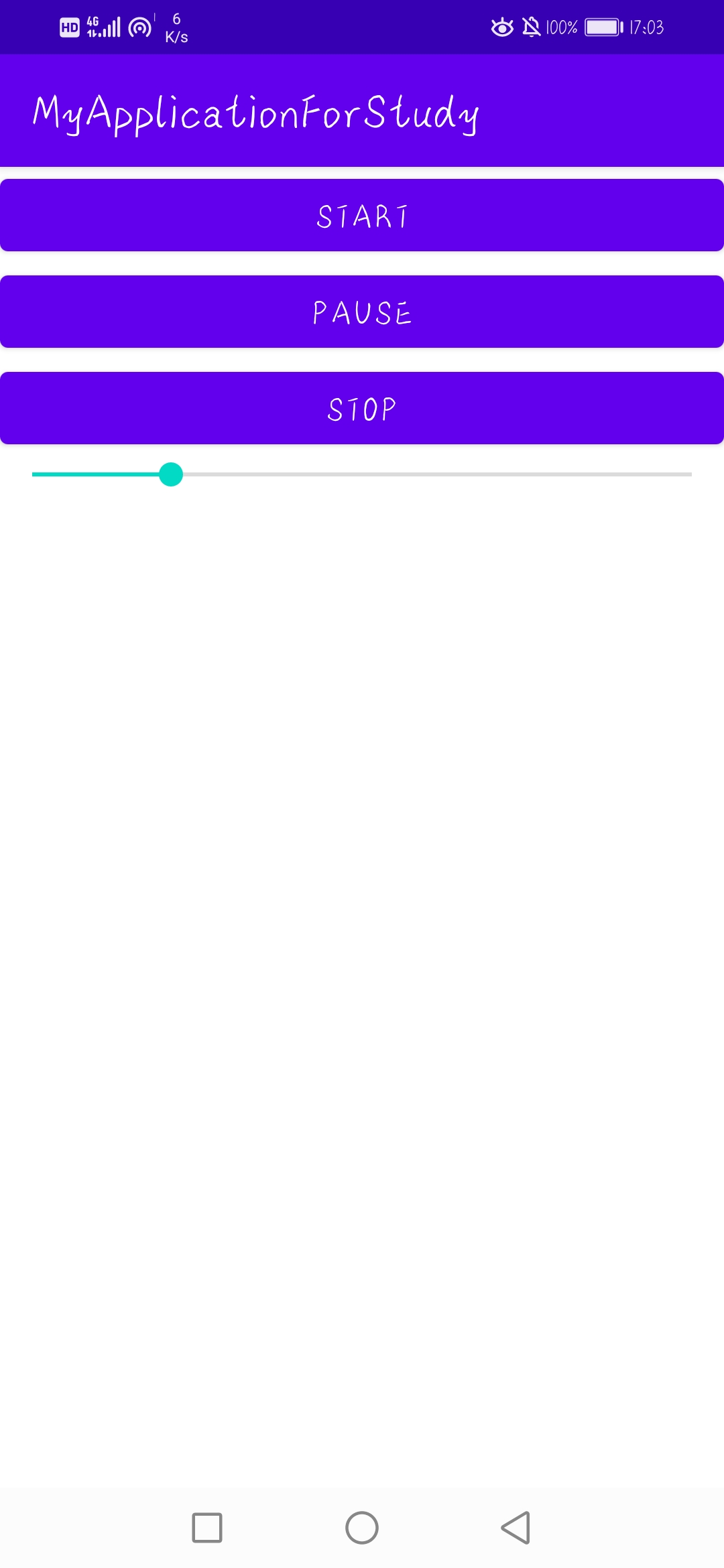 }效果图如下,点击对应的按钮实现音频的开始,暂停以及结束,点击进度条跳转至对应播放位置。注意在调用MediaPlayer的stop方法后若要开始音频则需要重新设置MediaPlayer的数据源。在退出APP时建议在onDestroy方法或者onStop方法上调用MediaPlayer的release方法释放系统资源或者在不使用MediaPlayer时调用该方法以减少系统资源占用。