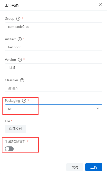如果开发框架有外部的maven引用,需要关闭pom文件选项,packaging选择jar上传jar包,然后完全一样的信息,packaging选择pom上传项目的pom文件共操作两次