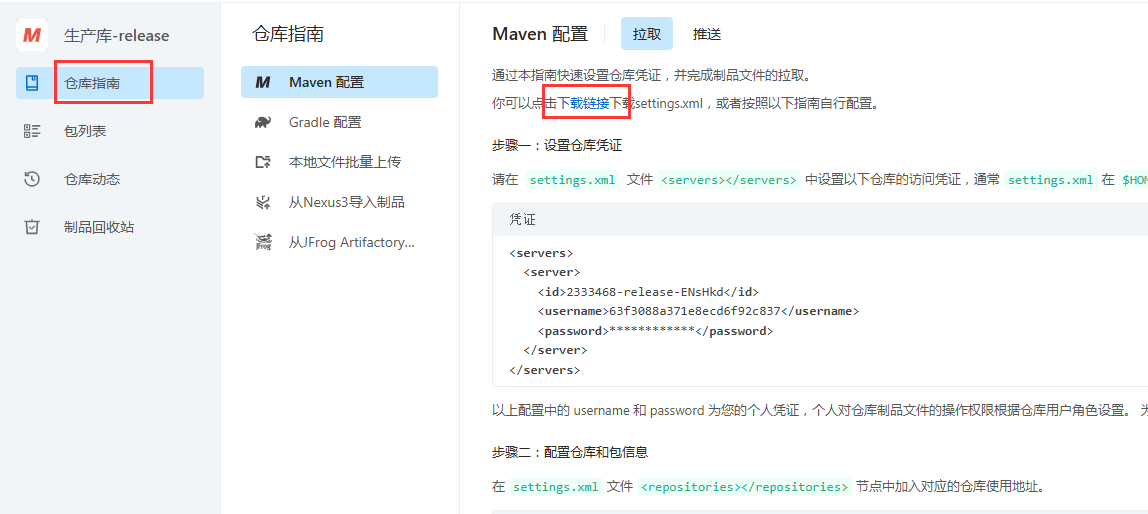 5.点击仓库指南下载对应的云效maven的setting.xml,创建单独的maven文件夹避免和本地自带maven冲突(创建repository文件夹并把setting.xml放在同级目录)
