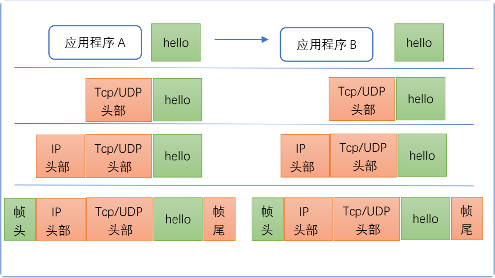 如下图,应用程序 A 要将数据”hello” 传给网络上另外一台主机上的应用程序 B, 数据“hello”从应用层发送给传输层后,传输层在数据前面加上 tcp 协议或 udp 协议的报头,将整条报文发给网络
