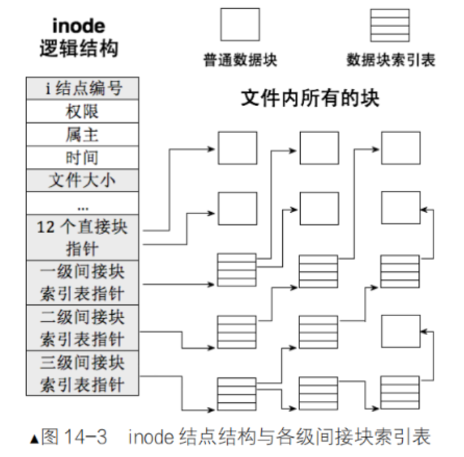 /* * Structure of an inode on the disk*/ struct ext2_inode {__le16 i_mode; /* File mode */__le16 i_uid; /* Low 16 bits of Owner Uid */__le32 i_size; /* Size in bytes */__le32 i_atime; /* Access time */__le32 i_ctime; /* Creation time */__le32 i_mtime; /* Modification time */__le32 i_dtime; /* Deletion Time */__le16 i_gid; /* Low 16 bits of Group Id */__le16 i_links_count; /* Links count */__le32 i_blocks; /* Blocks count */__le32 i_flags; /* File flags */union {struct {__le32 l_i_reserved1;} linux1;struct {__le32 h_i_translator;} hurd1;struct {__le32 m_i_reserved1;} masix1;} osd1; /* OS dependent 1 */__le32 i_block[EXT2_N_BLOCKS]; /* Pointers to blocks */__le32 i_generation; /* File version (for NFS) */__le32 i_file_acl; /* File ACL */__le32 i_dir_acl; /* Directory ACL */__le32 i_faddr; /* Fragment address */union {struct {__u8 l_i_frag; /* Fragment number */__u8 l_i_fsize; /* Fragment size */__u16 i_pad1;__le16 l_i_uid_high; /* these 2 fields */__le16 l_i_gid_high; /* were reserved2[0] */__u32 l_i_reserved2;} linux2;struct {__u8 h_i_frag; /* Fragment number */__u8 h_i_fsize; /* Fragment size */__le16 h_i_mode_high;__le16 h_i_uid_high;__le16 h_i_gid_high;__le32 h_i_author;} hurd2;struct {__u8 m_i_frag; /* Fragment number */__u8 m_i_fsize; /* Fragment size */__u16 m_pad1;__u32 m_i_reserved2[2];} masix2;} osd2; /* OS dependent 2 */ };#define EXT2_NDIR_BLOCKS 12 #define EXT2_IND_BLOCK EXT2_NDIR_BLOCKS #define EXT2_DIND_BLOCK (EXT2_IND_BLOCK + 1) #define EXT2_TIND_BLOCK (EXT2_DIND_BLOCK + 1) #define EXT2_N_BLOCKS (EXT2_TIND_BLOCK + 1)//inode 的大小通常是 128 字节 或 256 字节block数组里前12个下标存的是直接的数据块编号,后3个本质是做多级索引,让存储的数据块不存储文件数据,而是存储更多的该文件的数据块编号,[12]是存下一级索引的数据块编号(一级索引),[13]是二级索引,[14]是三级索引。