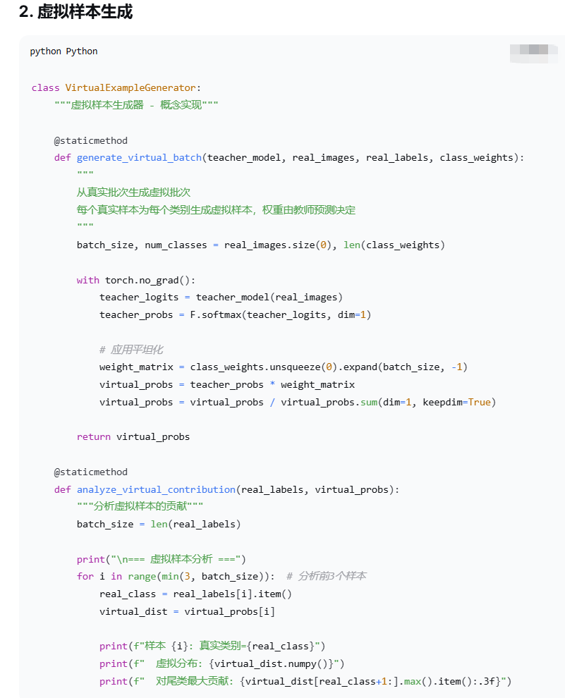 | 基本思路 | 将教师模型对输入图像的预测视为"虚拟样本"-1。 | 例如,一张狗的图片预测为(0.7狗, 0.3猫),则生成0.7个狗的虚拟样本和0.3个猫的虚拟样本-1。 | 尾部类别样本稀少,模型难以学习有效特征。 |