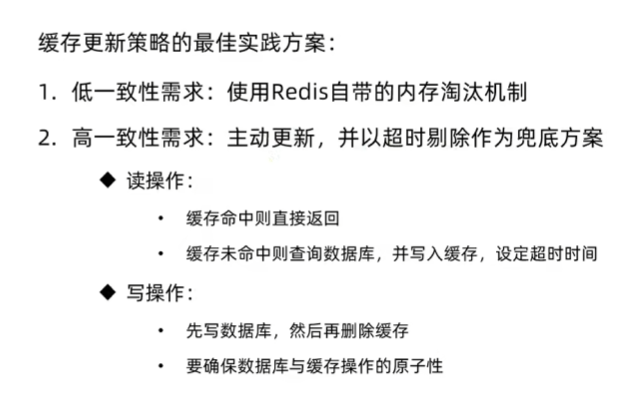 public class ShopTypeServiceImpl extends ServiceImpl<ShopTypeMapper, ShopType> implements IShopTypeService {@Resourceprivate StringRedisTemplate stringRedisTemplate;@Overridepublic Result showlist() {//从redis查找String key = "cache:shop:type";String shopType = stringRedisTemplate.opsForValue().get(key);//如果不为空返回if(StrUtil.isNotBlank(shopType)){List<ShopType> shopTypeList = JSONUtil.toList(shopType,ShopType.class);return Result.ok(shopTypeList);}//如果为空,从数据库查找List<ShopType> ShopTypes = query().orderByAsc("sort").list();//如果数据库没有,报错if(ShopTypes.isEmpty()){return Result.fail("没有数据");}//缓存到redisstringRedisTemplate.opsForValue().set(key,JSONUtil.toJsonStr(ShopTypes));return Result.ok(ShopTypes);}