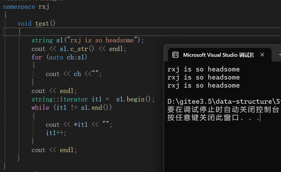 - 因为有const修饰的string对象,所以我们就不能再使用简单的iterator了,我们需要用const_iterator,同时参数传递的时候this指针也要用const修饰。