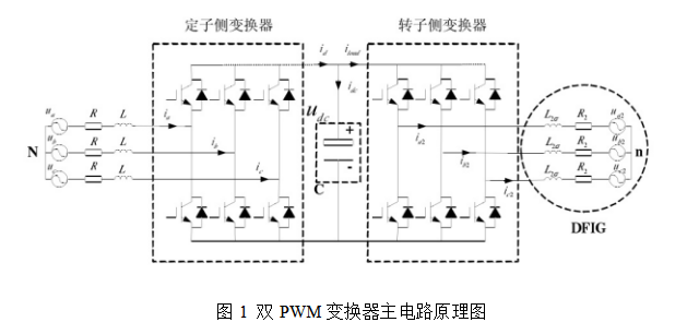 其主电路如图1所示,图中靠近电网的变换器为定子侧变换器,靠近DFIG转子的变换器为转子侧变换器。