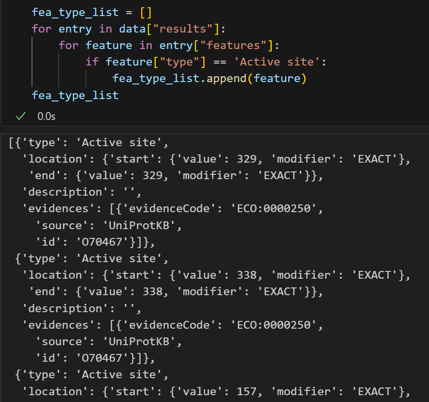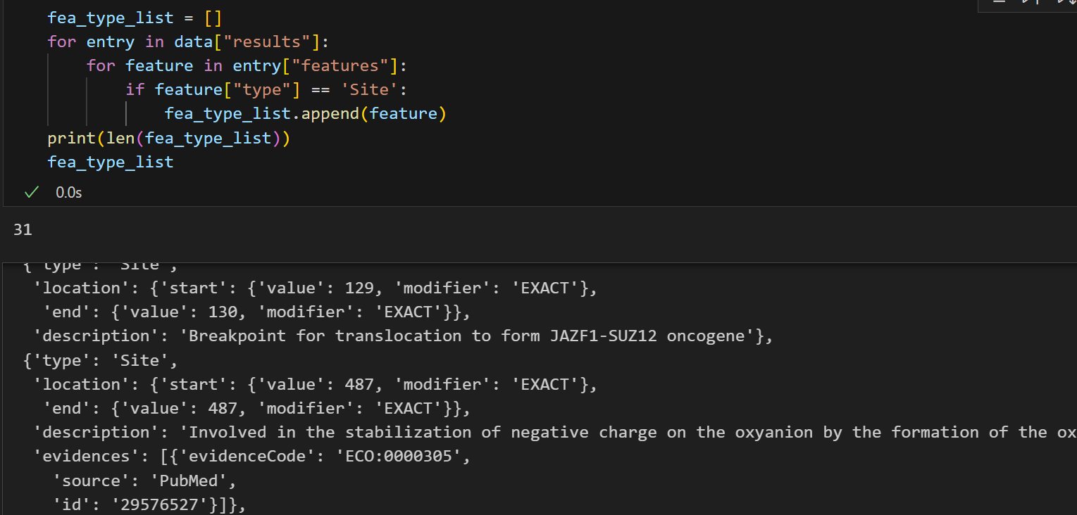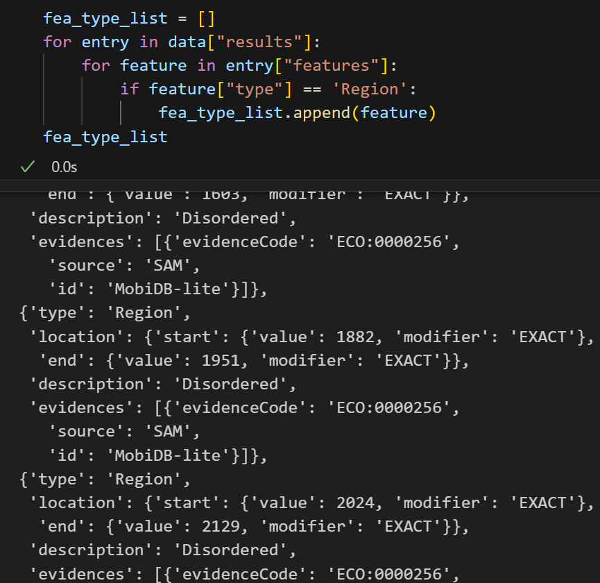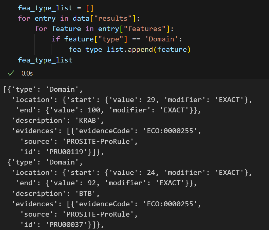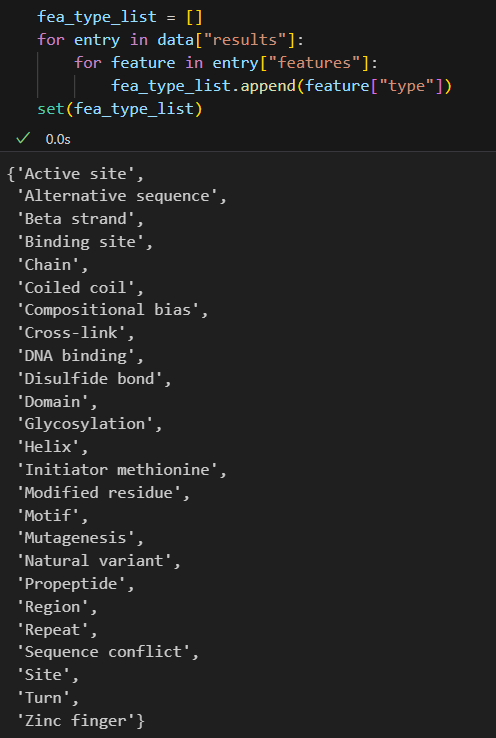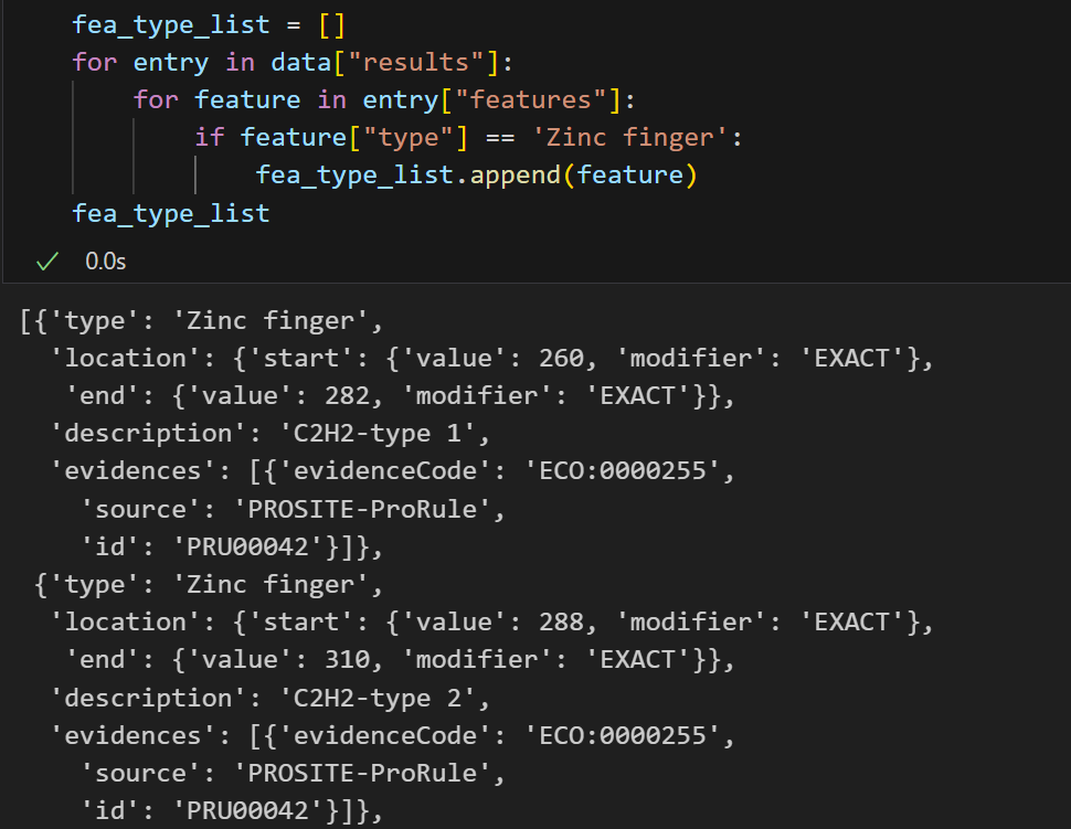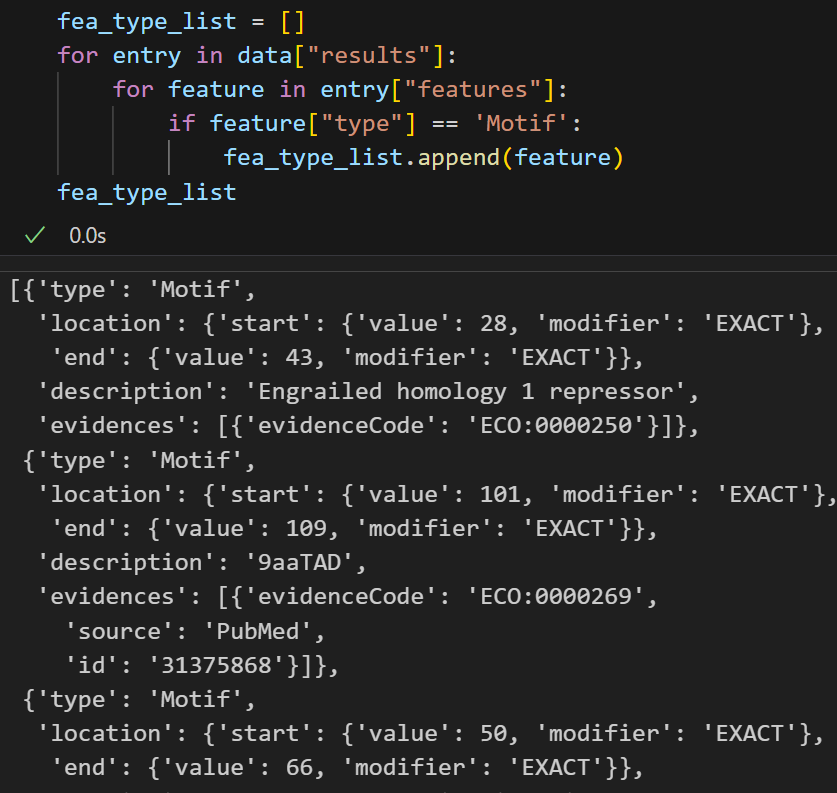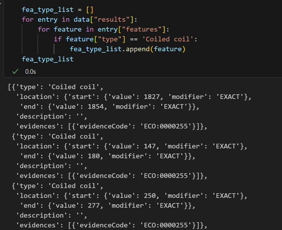 for entry in data["results"]:for feature in entry["features"]:if feature["type"] == 'Coiled coil':fea_type_list.append(feature)