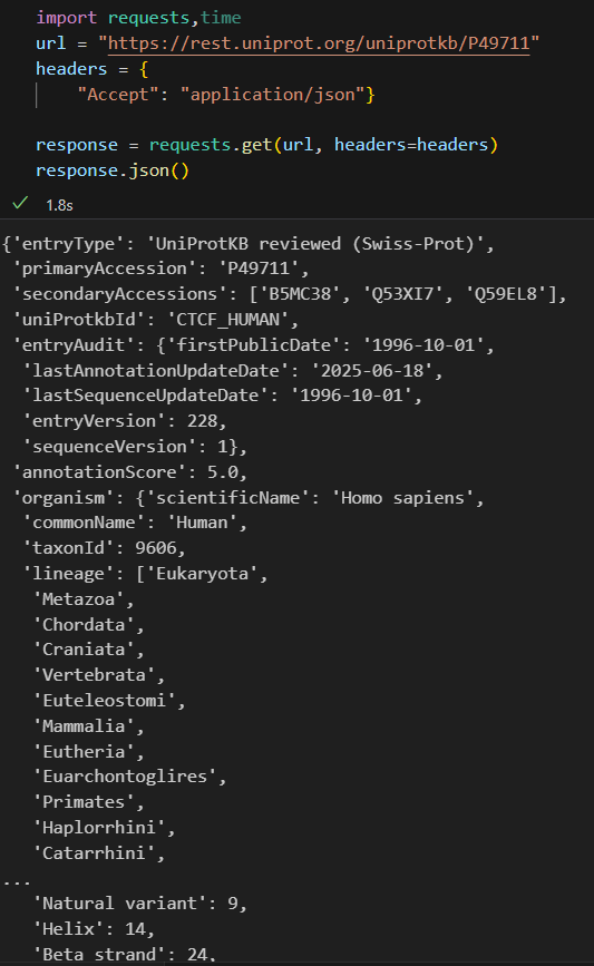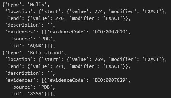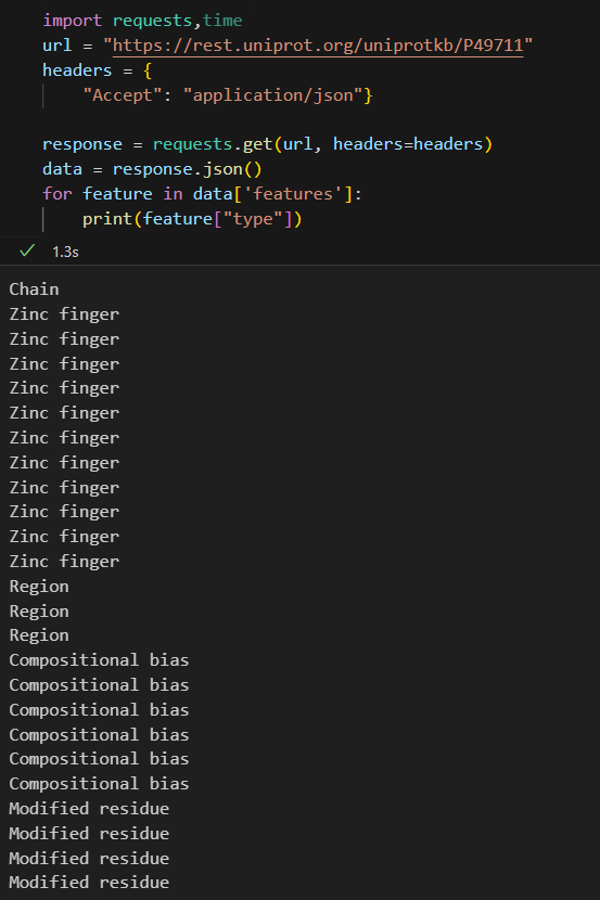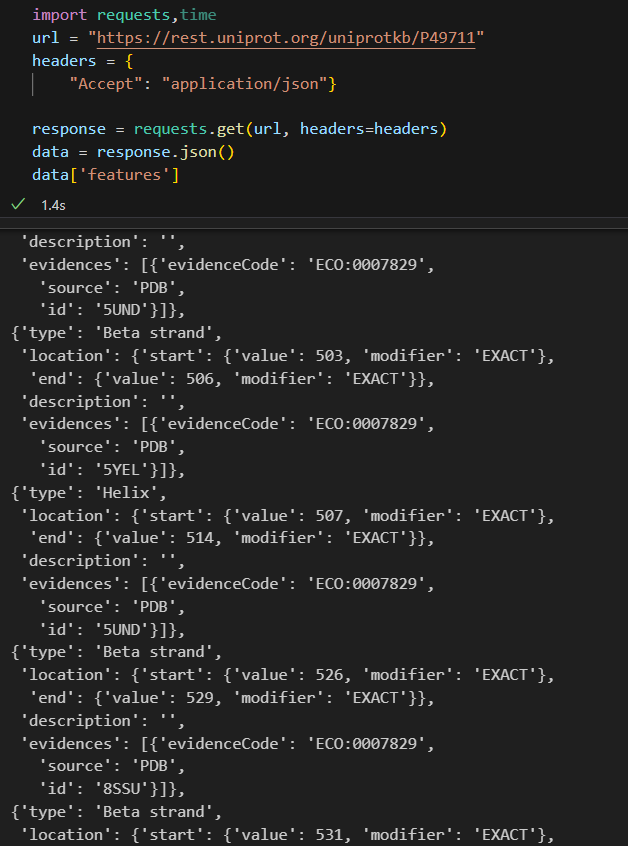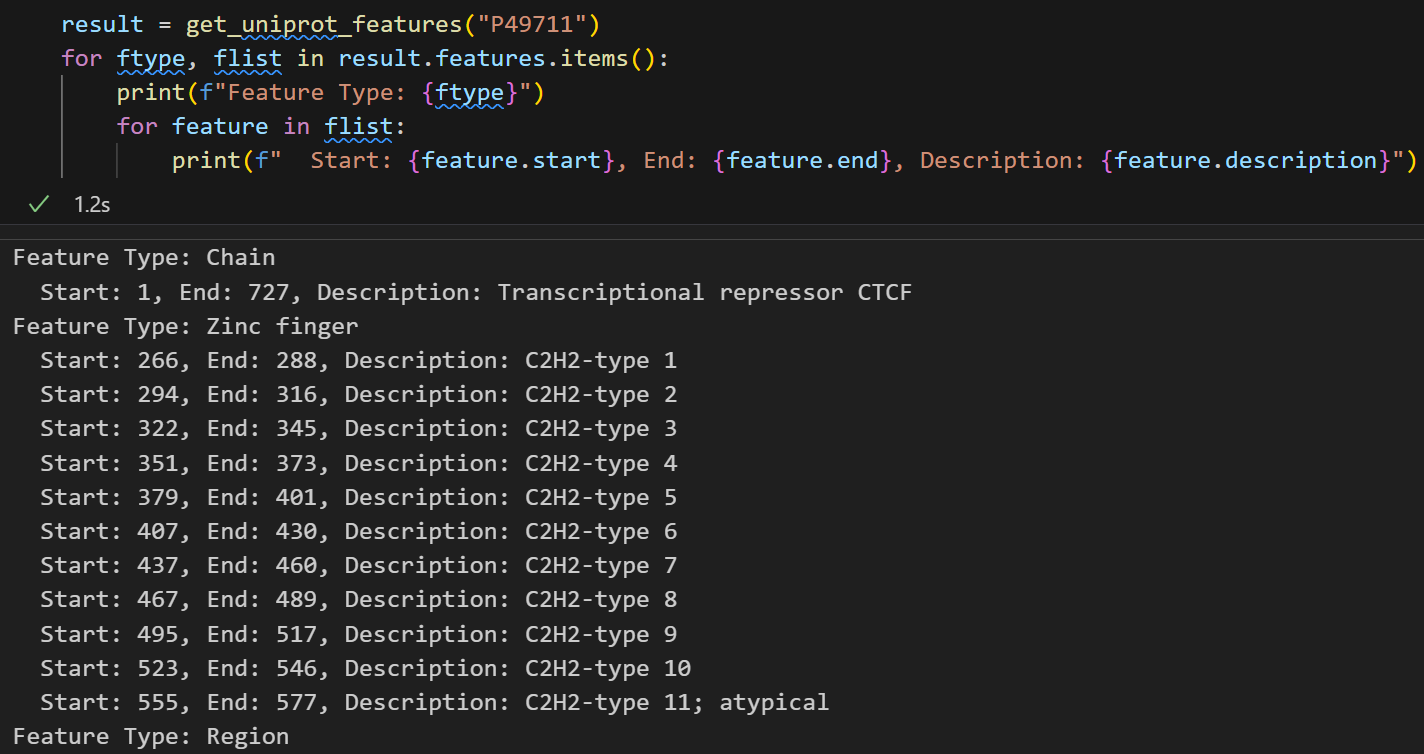 class UniProt_Feature_Analysis_Result:"""Description----------UniProt特征分析结果类, 存储从UniProt数据库获取的蛋白质特征信息列表Args----------features (List[UniProt_Feature]): UniProt特征列表Returns----------Dict[str, List[UniProt_Feature]]: 以特征类型为键, 特征列表为值的字典, 也就是features按类型分类存储;所以同一类型的feature会被存储在同一个列表中"""features: Dict[str, List[UniProt_Feature]]def get_uniprot_features(protein_id: str) -> UniProt_Feature_Analysis_Result:"""Description----------从UniProt数据库获取指定蛋白质的特征信息Args----------protein_id (str): UniProt蛋白质IDReturns----------UniProt_Feature_Analysis_Result: UniProt特征分析结果对象"""url = f"https://rest.uniprot.org/uniprotkb/{protein_id}"# 指定返回JSON格式headers = {"Accept": "application/json"}response = requests.get(url, headers=headers, timeout=10)if response.status_code == 200:data = response.json()# 初始化features字典, feature_type作为键, 对应的UniProt_Feature列表作为值features: Dict[str, List[UniProt_Feature]] = {}for feature in data.get("features", []):f_type = feature.get("type")f_description = feature.get("description", "")f_start = feature["location"]["start"]["value"]f_end = feature["location"]["end"]["value"]uni_feature = UniProt_Feature(feature_type=f_type,start=f_start,end=f_end,description=f_description)# 如果该feature_type还未在字典中, 则初始化一个空列表if f_type not in features:features[f_type] = []# 将当前feature添加到对应类型的列表中features[f_type].append(uni_feature)return UniProt_Feature_Analysis_Result(features=features)