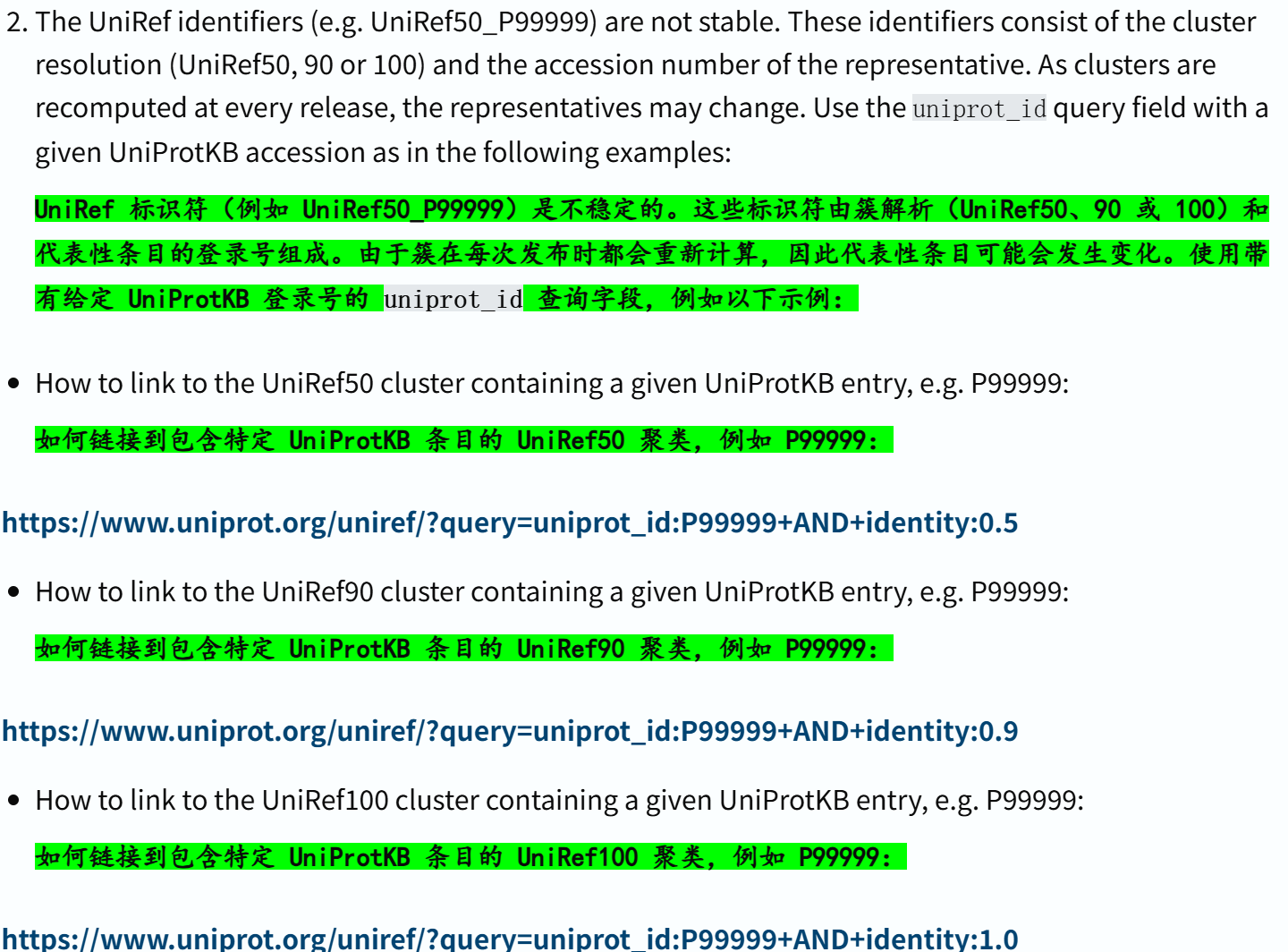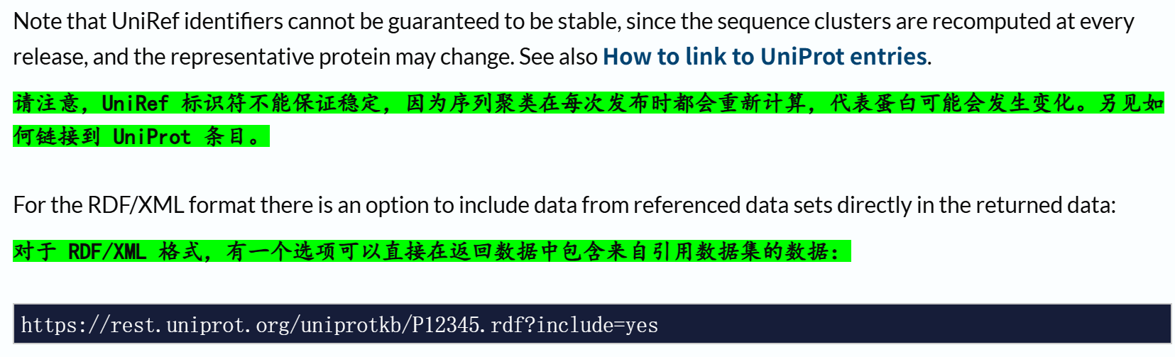 所以用户若需稳定链接 UniProt 条目,可参考 “如何链接到 UniProt 条目”(https://www.uniprot.org/help/linking_to_uniprot) 的相关内容,UniRef 标识符不适合长期固定引用,需通过其他更稳定的方式关联 UniProt 数据” 。