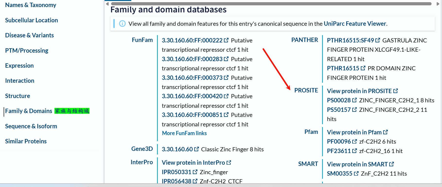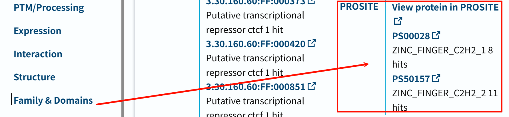 我箭头所指的就是PROSITE,这里是11 hits,也就是我们一般研究human CTCF蛋白公认的结构域组成。