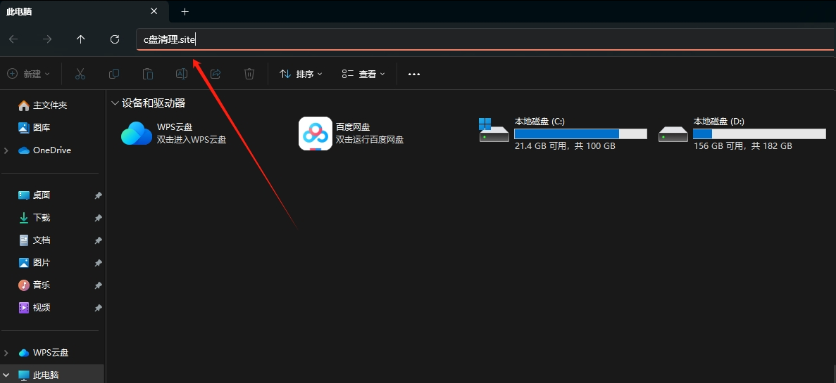 进入【此电脑】以后在顶部文件路径栏目输入:c盘清理.site(鼠标移到右侧的箭头点击)打开c盘清理工具。