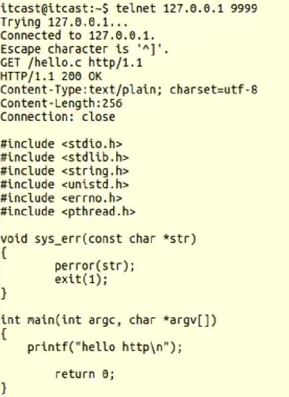 }void do_read(int cfd, int epfd) {//读取一行http协议,拆分,获取: GET 文件名 协议号char line[1024] = { 0 };//读http请求协议首行,GET /hello.c HTTP/1.1int len = get_line(cfd, line, sizeof(line));if (len == 0) {printf("服务器,检查到客户端关闭...\n");disconnect(cfd, epfd);}else {char method[16], path[256], protocol[16];sscanf(line, "%[^ ] %[^ ] %[^ ]", method, path, protocol);//客户端浏览器输入127.0.0.1:9876/hello.cprintf("method=%s, path=%s, protocol=%s\n", method, path, protocol);//把剩下的东西读走,避免拥塞网络while (1) {char buf[1024] = { 0 };len = get_line(cfd, buf, sizeof(buf));if (len == '\n') {break;}else if (len == -1) {break;}}if (strncasecmp(method, "GET", 3) == 0) {char* file = path + 1; //取出客户端要访问的文件名//如果没有指定访问的资源,默认显示资源目录中的内容if (strcmp(path, "/") == 0) {file = "./";}http_request(cfd, file);}}
