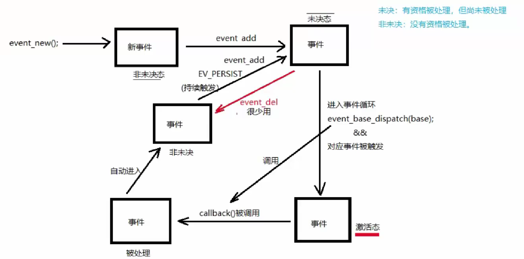 int event_del(struct event *ev);ev:event_new()的返回值。销毀事件: