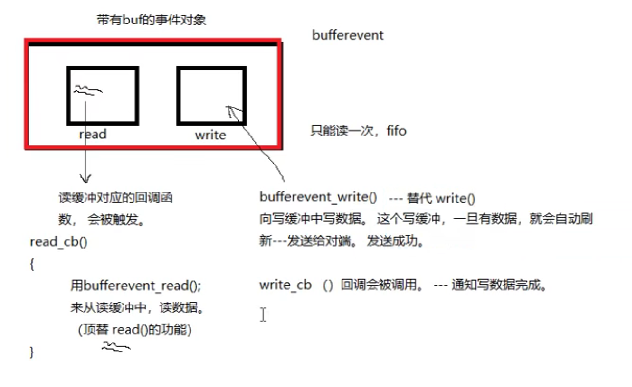 void bufferevent_enable(struct bufferevent *bufev,short events);events: EV_READ、EV_WRITE、EV_READ|EV_WRITE默认、write缓冲是enable、read缓冲是disablebufferevent_enable(evev, EV_READ); -—开启读缓冲。
