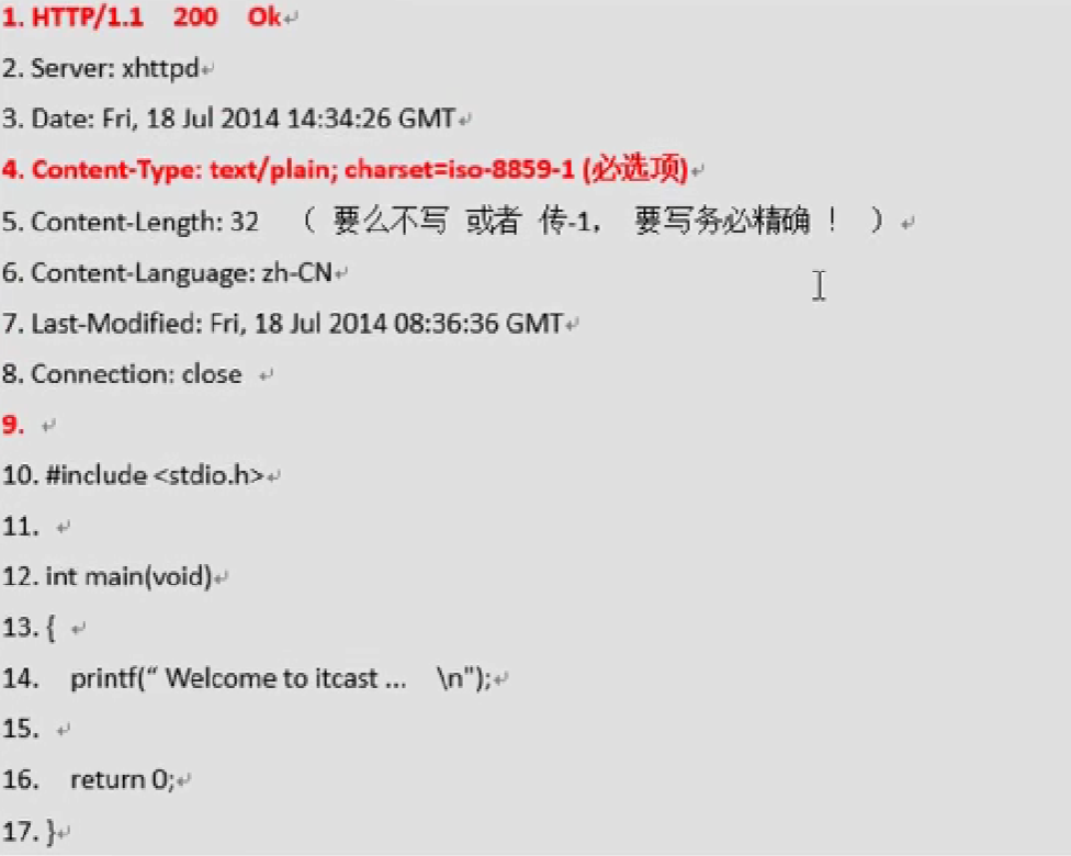 服务器-->发给-->浏览器。主旨内容包含4部分:状态行:包括http协议版本号,状态码,状态信息。消息报头:说明客户端要使用的一些附加信息。空行:必须!响应正文:服务器返回给客户端的文本信息。以下是经服务器按照http协议,写回给浏览器的内容举例,1~9行是协议头部分。
