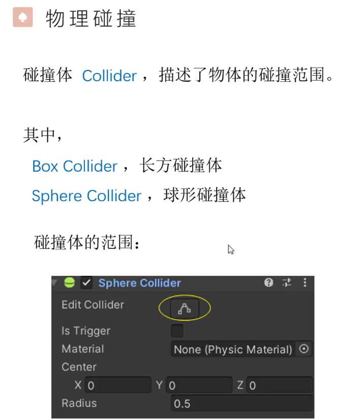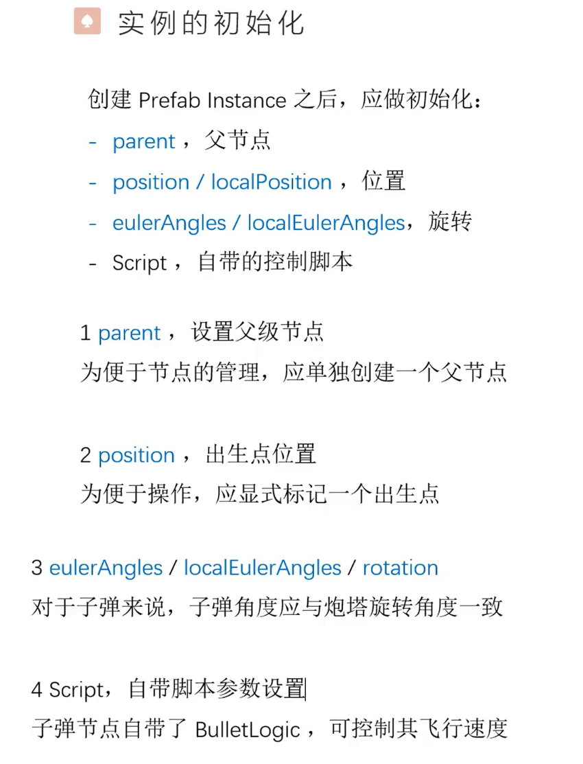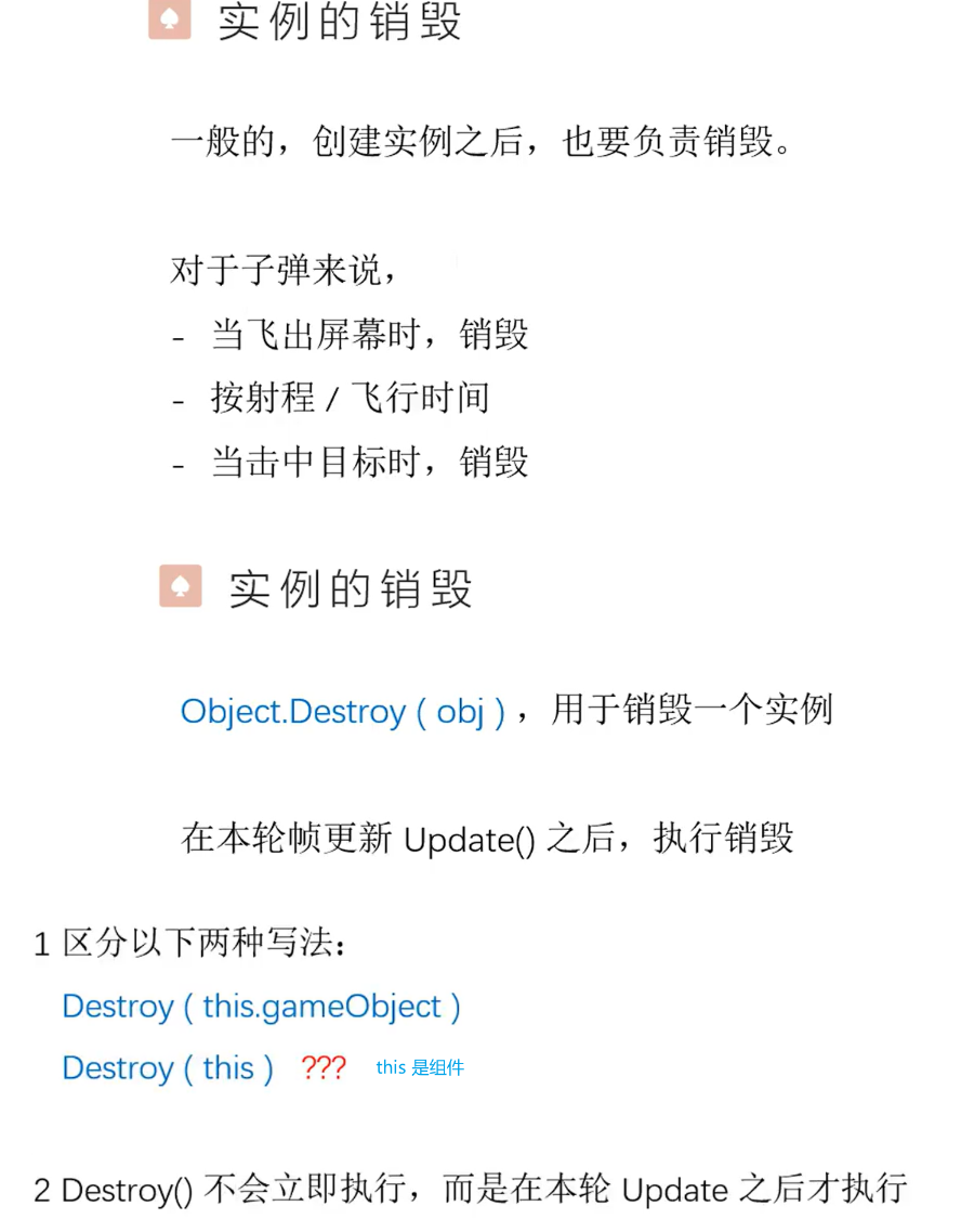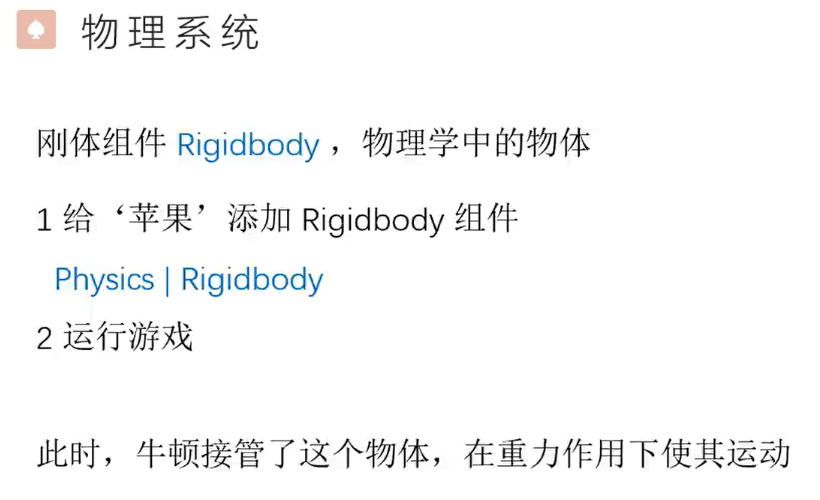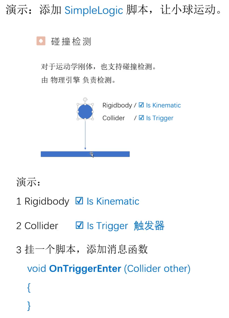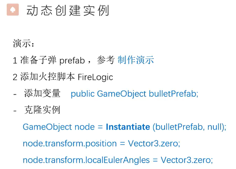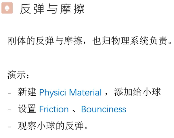public class FireLogic : MonoBehaviour{// 对子弹 prefab 资源的引用public GameObject bulletPrefab;public Transform bulletFather;public Transform firePosition;public Transform fireAngle;public float fireSpeed;public float fireTime;void Start(){}void Update(){if(Input.GetMouseButtonDown(0)){TestFire();}}void TestFire(){Debug.Log("* 创建子弹的实例 ..");GameObject node = Object.Instantiate(bulletPrefab, bulletFather);node.transform.position = firePosition.transform.position;// 在你的场景中,由于子弹的父级为 null,使用 localEulerAngles 和 eulerAngles 效果相同。// 但为了代码的清晰性和可维护性,建议使用 eulerAngles 或直接设置 rotation。node.transform.eulerAngles = fireAngle.transform.eulerAngles;BulletLogic bulletLogic = node.GetComponent<BulletLogic>();bulletLogic.speed = 1;bulletLogic.maxDistance = bulletLogic.speed * 5;}}public class BulletLogic : MonoBehaviour{public float speed;public float maxDistance;void Start(){float flytime = 1;if(speed > 0){flytime = maxDistance / speed;}Invoke("SelfDestroy", flytime);}void Update(){this.transform.Translate(0, 0, speed, Space.Self);}private void SelfDestroy(){Object.Destroy(this.gameObject);}}物理系统