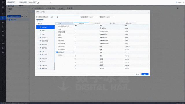 - 孪生体对象配置及数据绑定:为园区内所有的“孪生体对象”配置孪生体类别,将事先准备好的 业务数据库表、数据源等导入,精确定义 孪生体对象 的 台账字段、时序字段、三维外观控制,并进行数据绑定 (统一配置这些对象的数据从哪里来)。