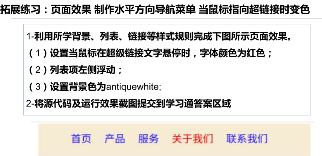 <!DOCTYPE html> <html lang="zh-CN"> <head><meta charset="UTF-8"><meta name="viewport" content="width=device-width, initial-scale=1.0"><title>水平导航菜单</title><style>div{width: 400px;height: 60px;margin: 0 auto;}ul {width: 380px;height: 50px;list-style: none;background-color: antiquewhite;}li {float: left;padding: 15px;}a {text-decoration: none;color: blue;}a:hover {color: red;}</style> </head> <body><ul><li><a href="#">首页</a></li><li><a href="#">产品</a></li><li><a href="#">服务</a></li><li><a href="#">关于我们</a></li><li><a href="#">联系我们</a></li></ul> </body> </html>