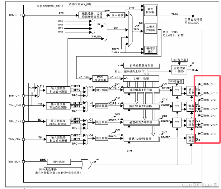 STM32的T1和T8是高级定时器,T2-T5是通用定时器,他们都可以输出PWM信号,用于驱动电机等负载。其中高级定时器的结构框图如图所示,其可以输出7路PWM信号;而通用定时器可以输出4个通道的PWM信号。