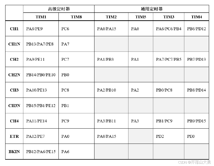 每个定时器的通道通过STM32的GPIO向外输出PWM信号,其映射关系如下: