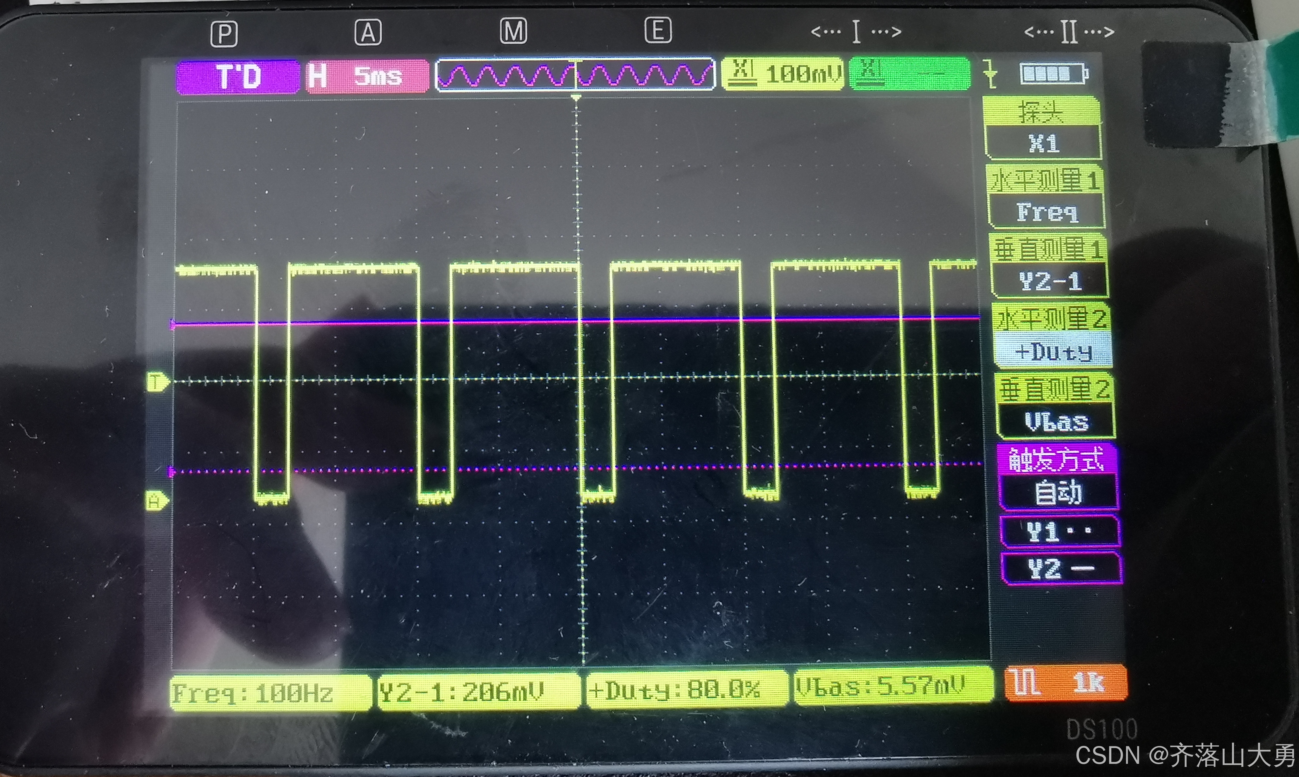 为了验证STM32输出PWM信号的使用方法,我们分别使用高级定时器T1和通用定时器T2的通道1,输出PWM信号。并通过按键改变所产生PWM信号的占空比。当按下按键时,示波器上的波形的占空比跟着变化。如图所示