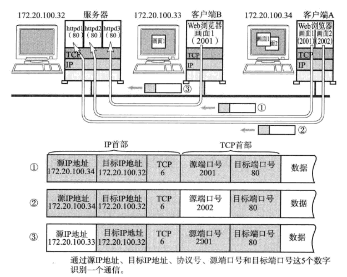 在TCP/IP协议中,用“源IP”、“源端口号”、“目的IP”、“目的端口号”、“协议号”这样一个五元组来标识一个通信。