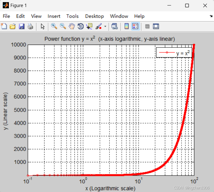 title('Power function y = x^2 (x-axis logarithmic, y-axis linear) '); % 图形标题