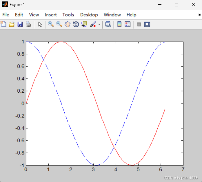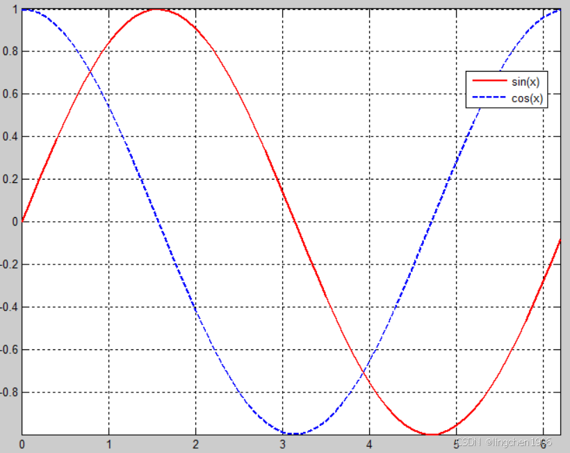 plot(x, y1, 'r-', x, y2, 'b--'); % 红色实线正弦,蓝色虚线余弦
