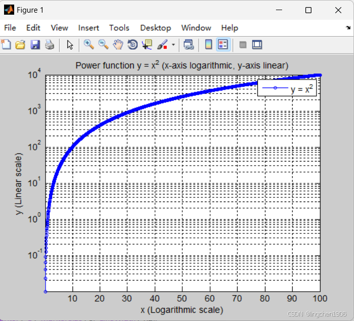 y = x .^ 2;% 3. 绘制图形(y轴对数刻度,x轴线性刻度)
