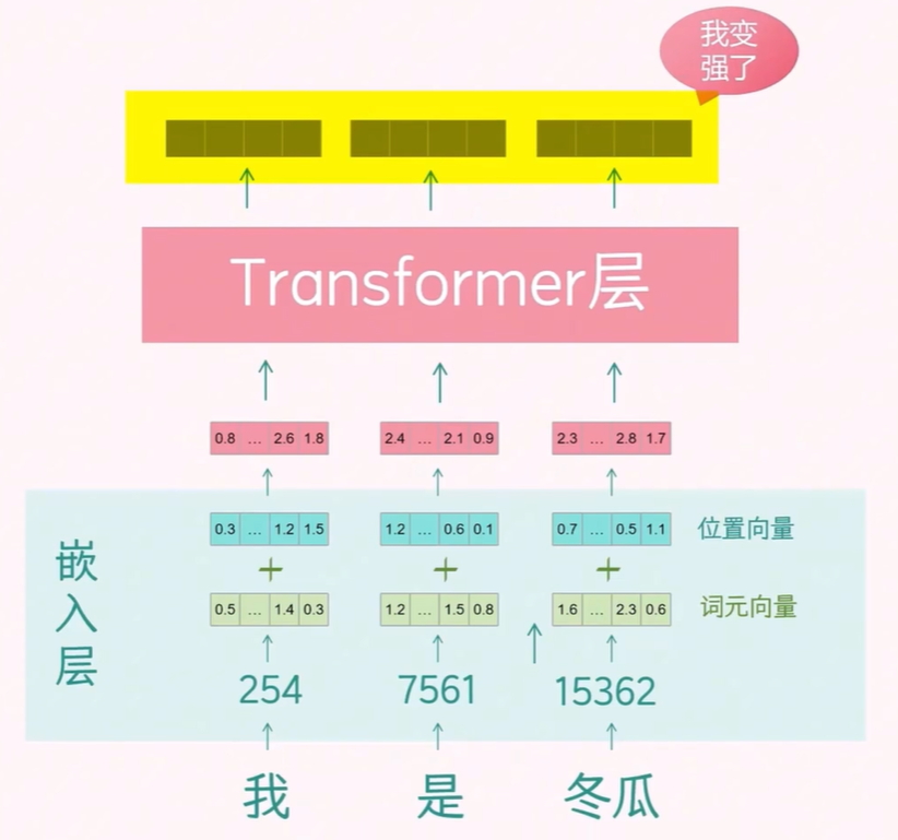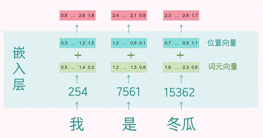 因此,嵌入层包含 token 的 token 向量和 positional 向量。token 向量表示 token 本身的含义,而 positional 向量携带 token 的位置信息。两者结合可以增强嵌入向量的语义表示能力。